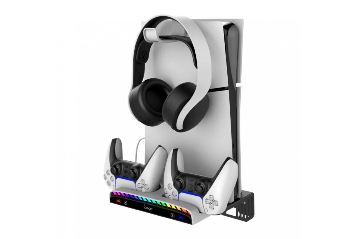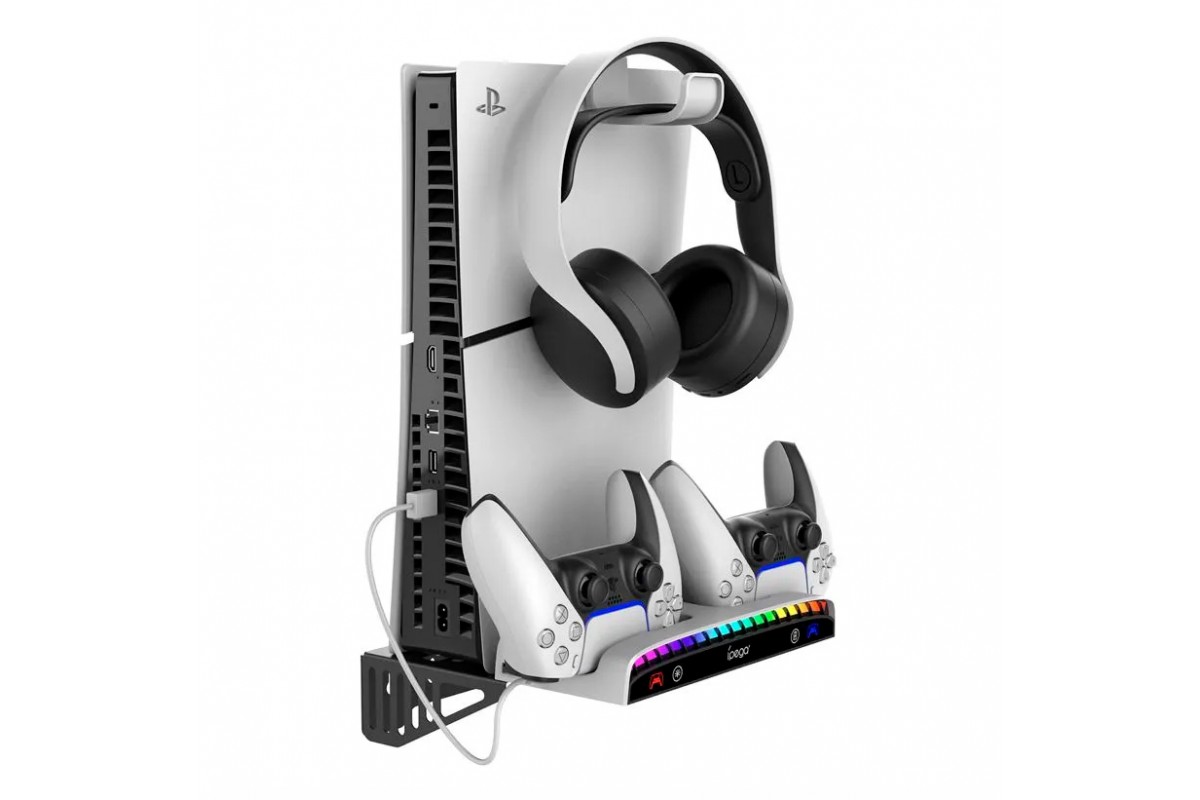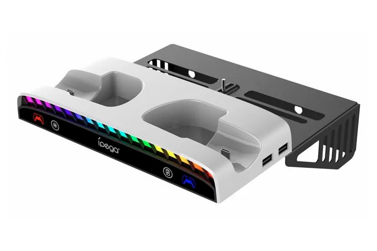 Крепление на стену + зарядная станция iPega для PS5 — двухфункциональный аксессуар, объединяющий настенное крепление для консоли PS5 Slim/PS5 и док-станцию для одновременной зарядки двух контроллеров DualSense.