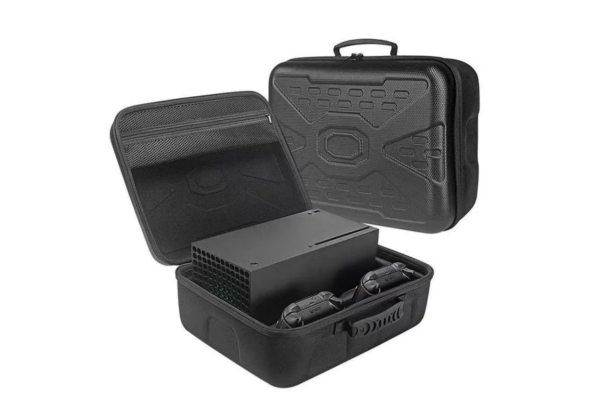 Чехол-кейс для Xbox Series X и геймпадов — жёсткий переносной кейс из EVA-пластика для безопасной транспортировки консоли Xbox Series X и двух контроллеров.
